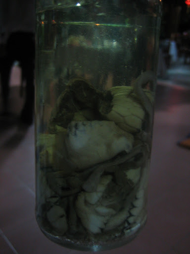 Then there was Friday night, with moments where I wondered "I can't believe I'm doing this." I let myself be talked into going to the infamous snake village outside of Hanoi. I'm trying to step out of my comfort zone, I guess. At the snake village, the typical routine is this: You pick out a snake. It's killed in front of you. It's heart, still beating, in put on a place on the table. It's blood is drained and mixed with rice alcohol, as is some other bodily fluid (helps with digestion and kind of green--bile I guess?). Someone drops the heart into their shot of blood-and-liquor, and everyone throws back the concoction. Yes, that means one person eats the still-beating heart. Then everyone does the shot of bile and rice liquor. Then all parts of the snake, cooked in a variety of ways, are served to you. Did I mention I'm trying to step out of my comfort zone? Did I mention that I haven't eaten meat in about 12 years? For better or worse, I'll now have to add "except for that one night at the snake village" to any future explanation of my vegetarianism. I went to the snake village with Becca, Meredith, Jenette, Kevin, and Becca's Vietnamese friend Hue. They brought out a snake. We approved their selection. They slit it open, pulled out the heart, put it on our table (yes, still beating), served us up shots of blood and bile mixed with rice alcohol. Becca dropped the tiny heart into her shot-o-blood, we counted to three, and we all drank up. Yes, I drank snake blood. Then I drank snake bile. Or something. Still not sure. THEN I ate snake soup, followed by seasoned, ground snake bones, followed by fried snake skin (apparently it tastes like pork rinds but I wouldn't know since I've never had a pork rind), followed by stirfried snake meat and veggies, followed by snake spring rolls, followed by more snake soup. In the words of my little sister, OMG. And I couldn't agree more. I didn't eat much of any of the above dishes--although the spring rolls were pretty good. Just a couple bites of everything. Just to say I did it. And to honor the spirit of the snake who died so we could have a meal and tell the tale. They really do use every part of the snake, though, which makes me feel a bit better. Even its poor little head gets thrown into a bottle of rice alcohol. Speaking of, we were also brought three bottles of rice alcohol--one with nothing in it (although it probably came from a larger jar with snakes in it), one with bees in it, and one with an unidentifiable snake or lizard of some sort. And I did (small) shots of all of them. Again, OMG.